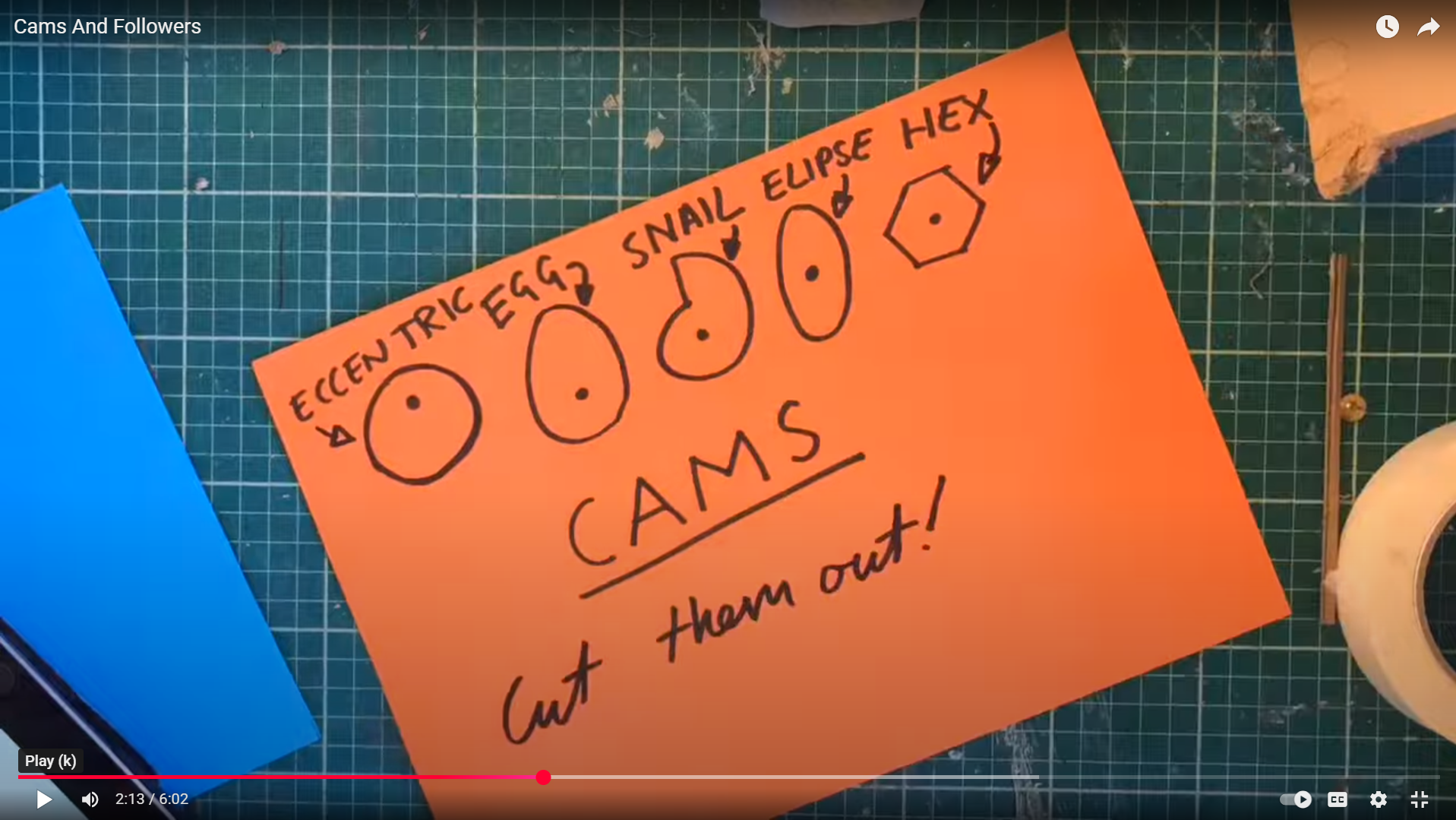 This screenshot from the same video shows some different types of cams, namely, eccentric, egg, snail, elipse and hex.