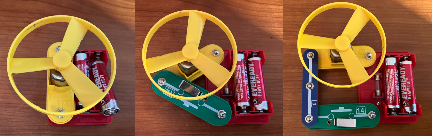 The following photos show various configurations to power an electric motor. The main point here is that there are many ways to configure a circuit, but a circuit will only work if the circuit is closed to complete the circuit. The example of the left is the simplest but it requires the battery to be removed to turn the motor on and off. The middle photo has a switch included. The photos on the right also contains an additional length of wire so that the components are spaced apart for more convenient operation of the circuit. (The yellow propeller is just sitting on the motor in each instance which is more engaging than just a rotating axle.)