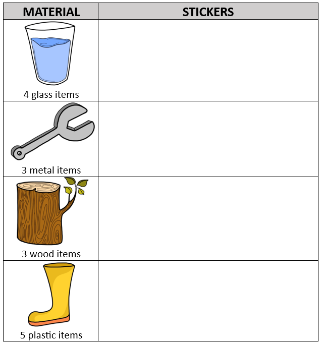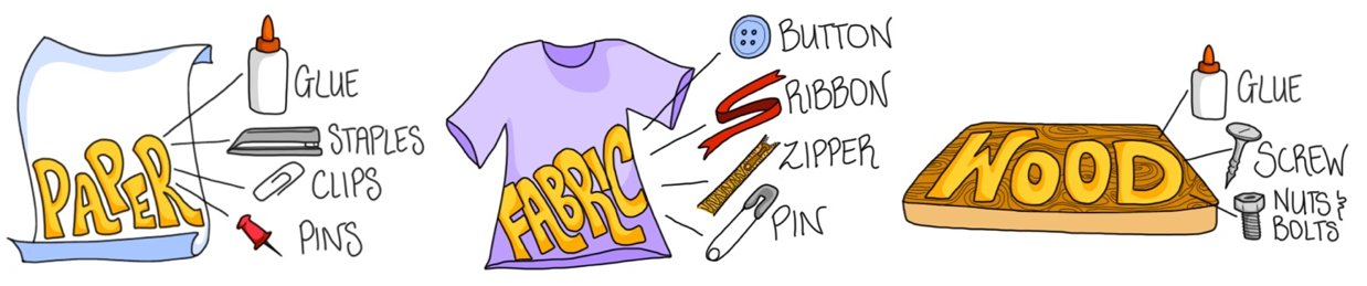 We are going to use our new knowledge of materials to build a puppet friend. Before we start, let’s think of some key features we want in our new friend, and what materials will help us achieve this. Maybe you want your character to be waterproof, or a knight in shining armour, or a superhero. Whatever features you decide will be right for your character, you need to decide what materials will make it achievable. Some material options are listed below.