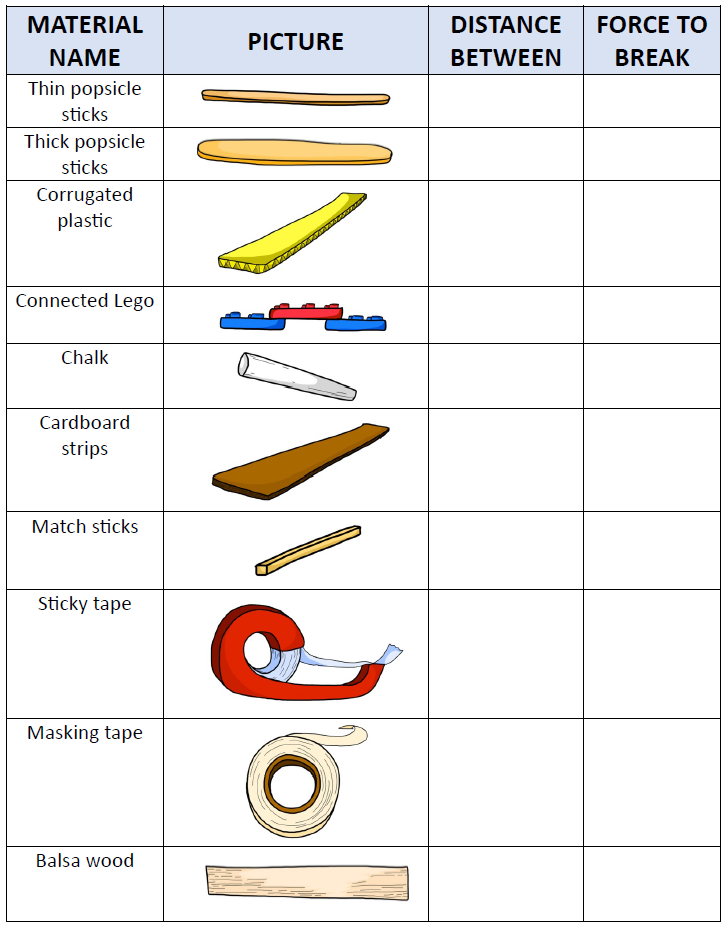 Activity: Today we are going to conduct a stress test on some common materials to see how strong they really are. This activity will work best working in pairs or groups of three. The following table is available here as an A4 page which you can print if required.
