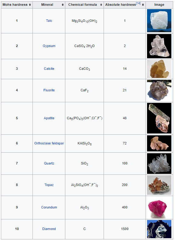 What do you notice when you compare the 'Mohs hardness' numbers with the 'Absolute hardness' numbers?Is there a direct correlation?